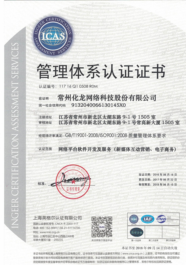 ISO9001认证是于1979年批准成立了质量管理和质量保证技术协会(ISO/TC176),具有负责制定有关质量管理和质量保证的国际标准,并于1987年发布了世界上第一个质量管理和质量保证系列国际标准---ISO9000系列标准。该标准的诞生是世界范围质量管理和质量保证工作的一个新纪元,对推动世界各国工业企业的质量管理和供需双方的质量保证,促进国际贸易交往起到了很好的作用。常州化龙网络科技股份有限公司作为在新三版上市的企业,很好的践行了ISO9001认证管理体系,并于2016年6月份顺利通过了ISO9001质量管理体系认证。 相信我司今后将迈入一个更高的抬阶。